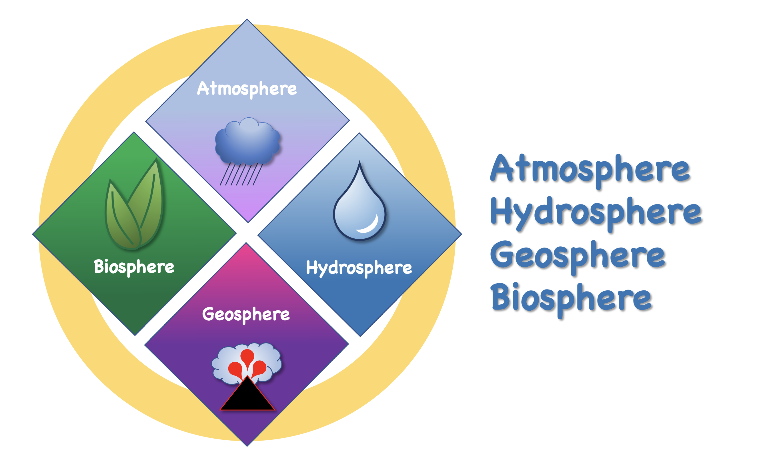 Earth’s climate – and climate change – arises from the interaction of energy with the different parts of the Earth, and from the interation of those parts with each other. One common way to divide the Earth into parts is to consider four interacting “spheres:”